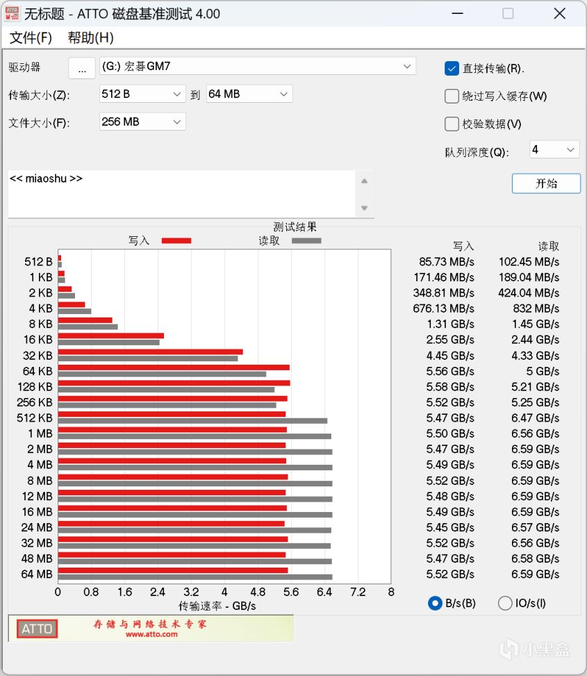 在ATTO测试中,可以看到随着数据块增大,从64K开始宏碁掠夺者GM7的读写速度保持着高度一致的稳定性,没啥毛病。
