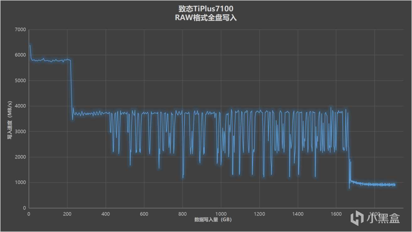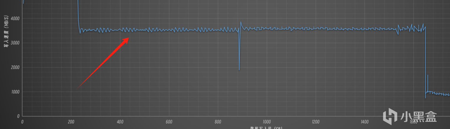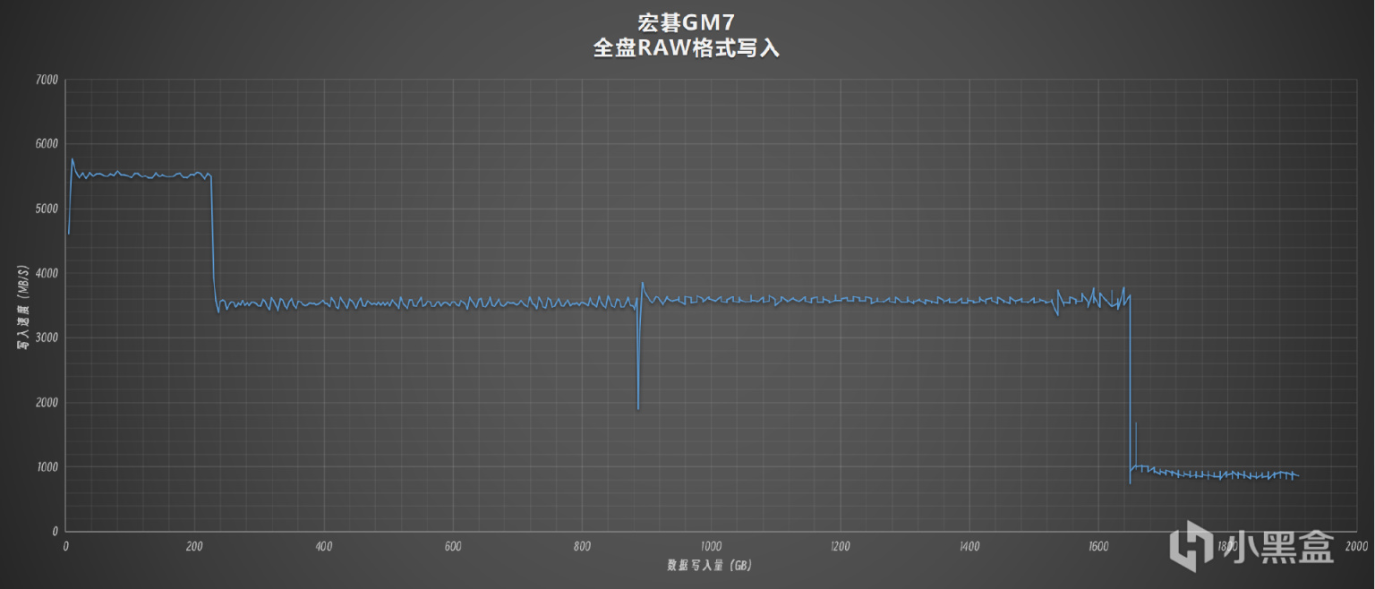 第二段曲线显示的是TLC颗粒的直接写入性能,此时没有了SLC缓存的干扰,我们可以看出来宏碁掠夺者GM7的直写性能非常强,平均速度能达到3500MB/s左右,这个速度表现和TiPlus7100非常类似,在我测试过的国产SSD中妥妥的属于第一梯队:
