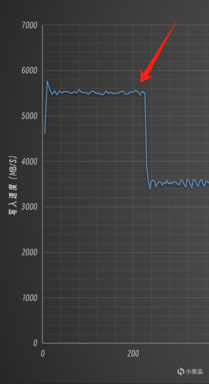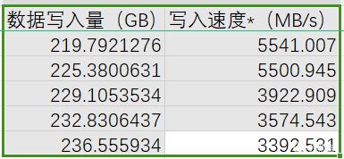 从写入曲线可以看出,宏碁掠夺者GM7依然是国产SSD中常见的三段式写入结构,其中空盘状态下SLC Cache空间大约为228G左右,同时SLC缓内写入速度在5500MB/s左右。