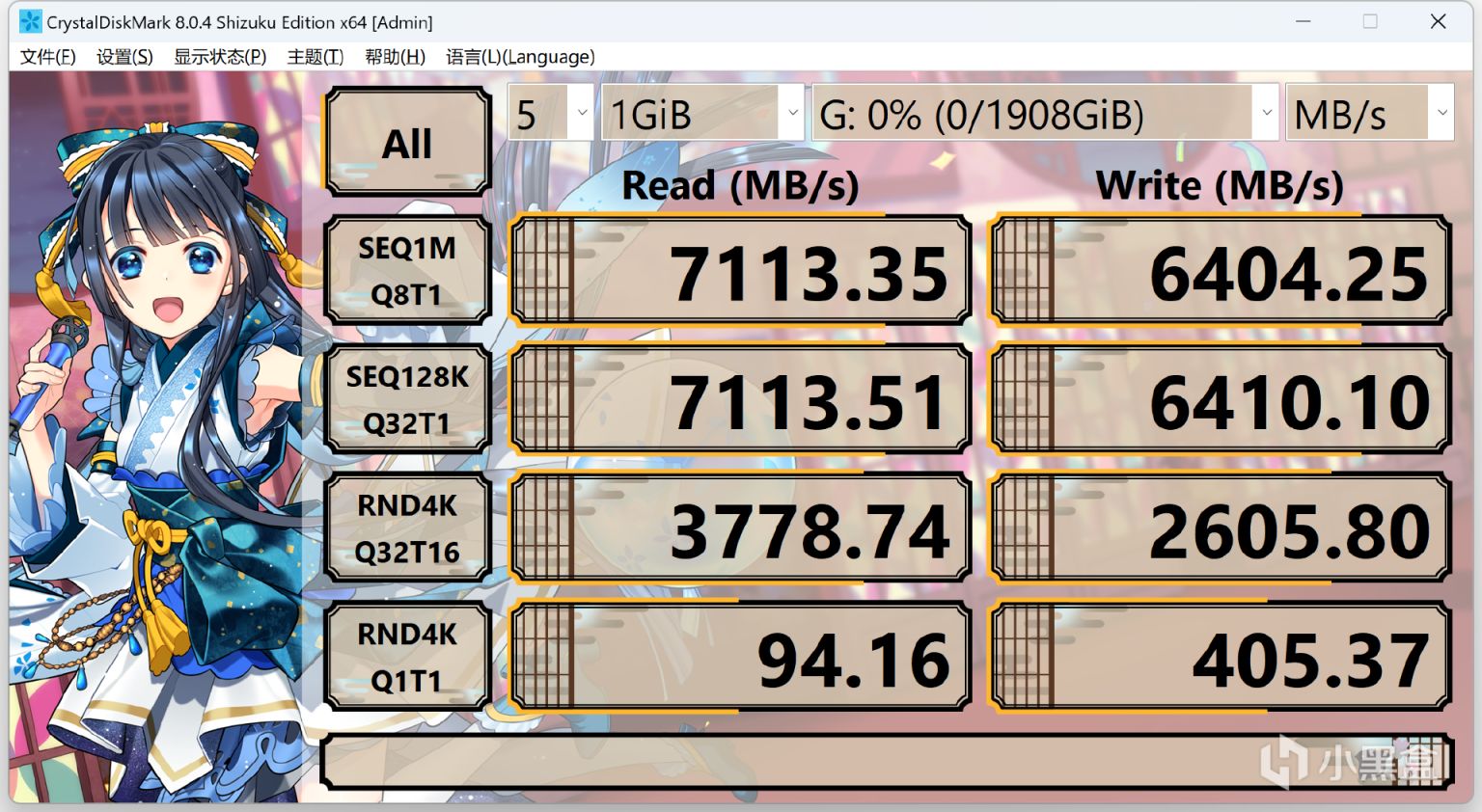 空盘状态下,宏碁掠夺者GM7的顺序读取速度为7113MB/s,顺序写入速度为6404MB/s,均超过了官方标称的性能参数,是目前PCIe4.0 SSD的满速水准。