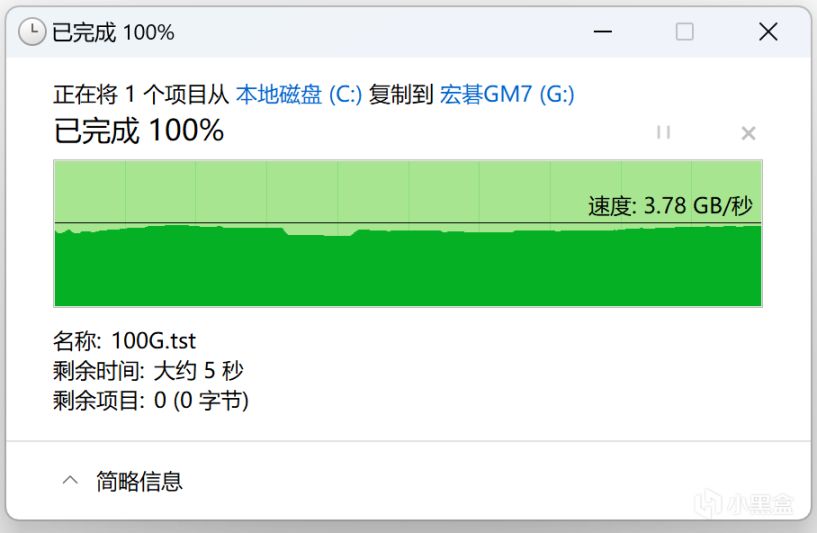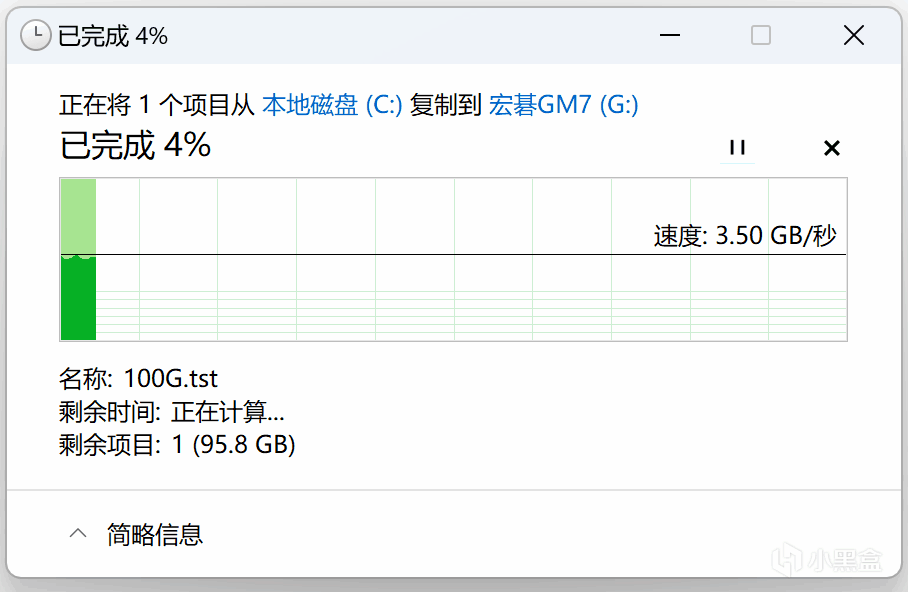 那么在Windows11中,宏碁掠夺者GM7的实际写入情况如何呢?这里我在系统盘雷克沙NM800 Pro中生成了一个100G大小的测试用大文件,可以看到整个写入速度基本维持在了3.6GB/s左右,这基本快触及到了Windows文件系统的单线程读写可用上限了。