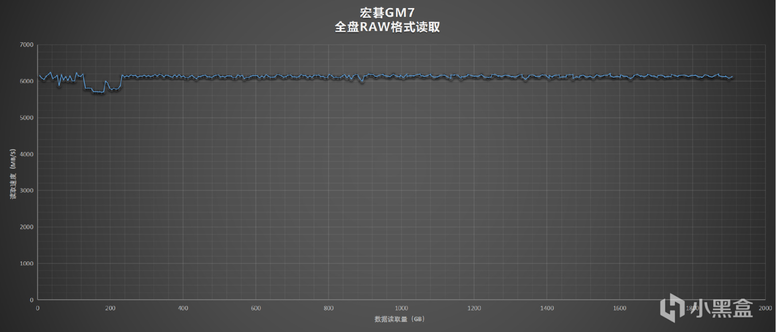 看完了顺序写入的性能,我们再来看看顺序读取的性能吧。同样在RAW格式下进行全盘读取一次的操作,读取曲线非常稳定,基本维持在了6000MB/s左右。