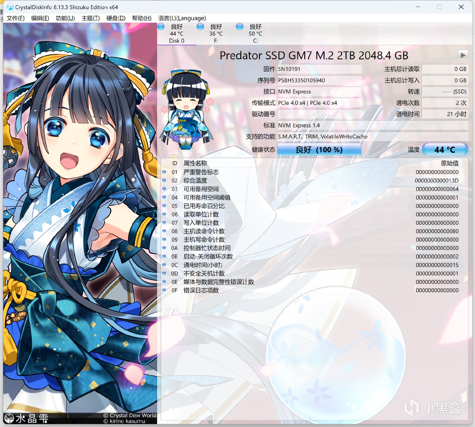 在CrystalDiskInfo中可以看到宏碁掠夺者GM7是足容的2048GB容量,支持NVMe 1.4协议标准。由于二进制与十进制的转换关系,其在WIndows中的实际可用容量为1907GiB。