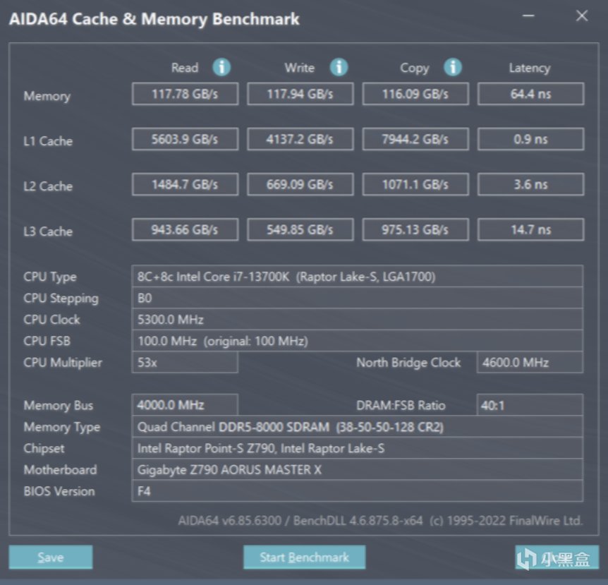 不过此时由于CPU体质实在是不给力,所以不敢再尝试打开“高带宽低延迟”模式了。此时内存的读取速度为117.78GB/s,写入速度 117.94GB/s,复制速度116.09GB/s,延迟64.4ns,与7600MHz+高带宽低延迟模式下的成绩相仿,甚至延迟还要高一些。