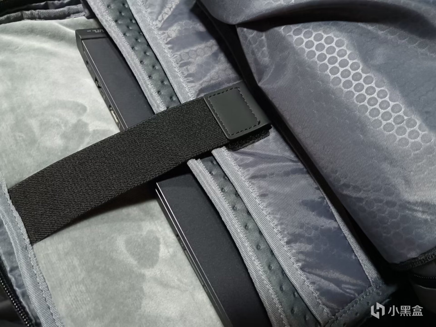 這款揹包的設計其實是上了心的,就比如放置電腦的後側背板可以通往前面的大口袋,前面的大口袋畢竟是一個卷口設計,打開拿取然後再還原,這個過程其實挺繁瑣的,從後側拿取就比較簡便了,實測非常好使。