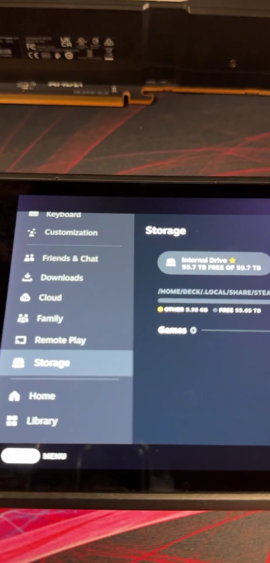 最后,Ranous 使用适配器将 Re-Image USB 驱动器插入 Steam Deck, 立即识别出了 SSD,并可以使用其庞大的 55.7TB 格式化存储。 当然,如果你随身携带它,这几乎不是一个实用的解决方案,但它仍然是一个非常酷的模组。