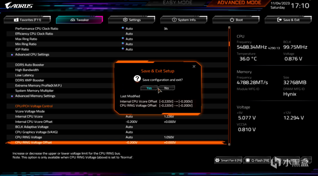 進入技嘉主板BIOS,再Select MCU選項更改爲104微碼,更改Vcore Voltage Mode爲Adaptive Vcore模式,然後手動將Internal CPU Vcore offset和CPU RING Voltage Offset更改爲-0.2,也就是負壓0.2V。