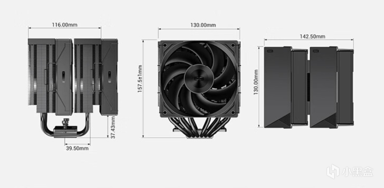 散熱器主體長130mm寬116mm高157mm,散熱風扇安裝後寬慰142.5mm,支持41mm以下高度內存,金百達這款官標高度爲41.4mm,但實際上機仍有一部分空間空餘。熱管和散熱銅底的中心點距離爲39.5mm。