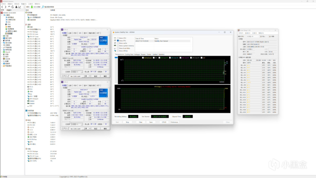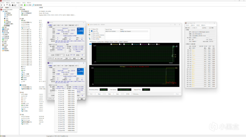最終260瓦壓制再100度以內,大核心從5.5降頻到4.9,小核心從4.3降頻到4.1,由於B760不支持CPU超頻,性能受限嚴重,只能通過合理的降壓達到性能全釋放的目的。