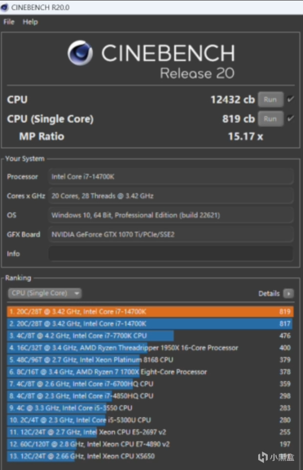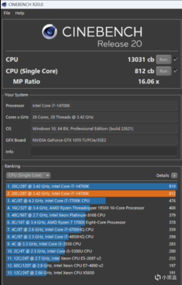 R20跑分:單核812,多核13031,單核小降,多核性能反而有提升。