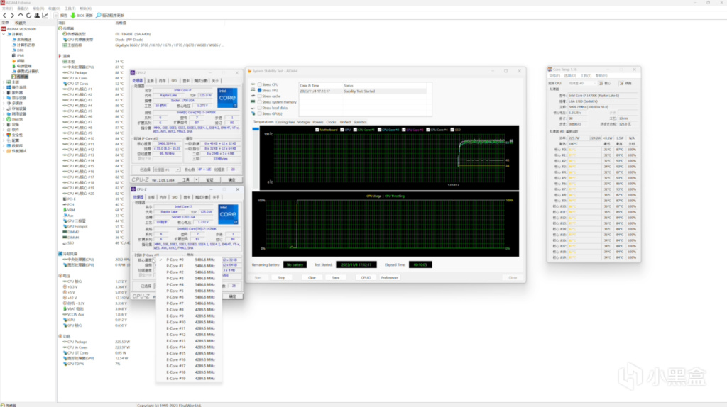 最終將14700K控制在225瓦,溫度最高90度,大核全核5.5,小核全核4.3,並且烤機10分鐘過測,如果是Z790主板,甚至可以壓線散熱器的最大散熱功耗260瓦,負壓0.1V,再小超一把大核和小核。