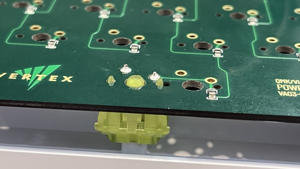 说回ARC60,Vertex 之所以对有钢和无钢结构切换的设计能够如此自信,源自他们对于内胆,对于支撑与形变的理解,而在PCB方面,无论是焊接还是热插拔,ARC60不同以往,选择了1.6mm且不开槽(No Flex cuts)的配置。