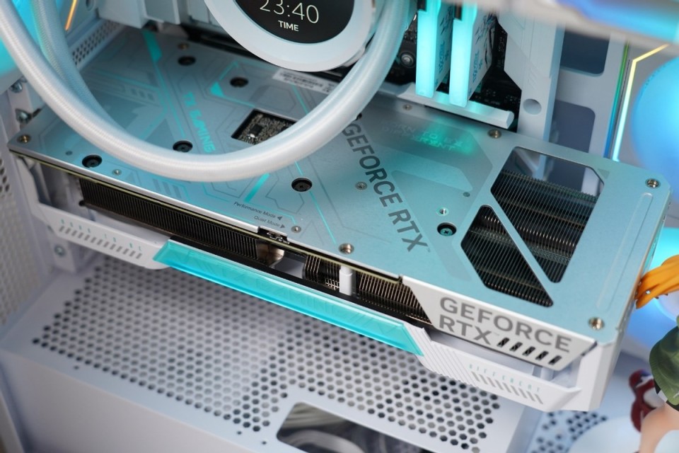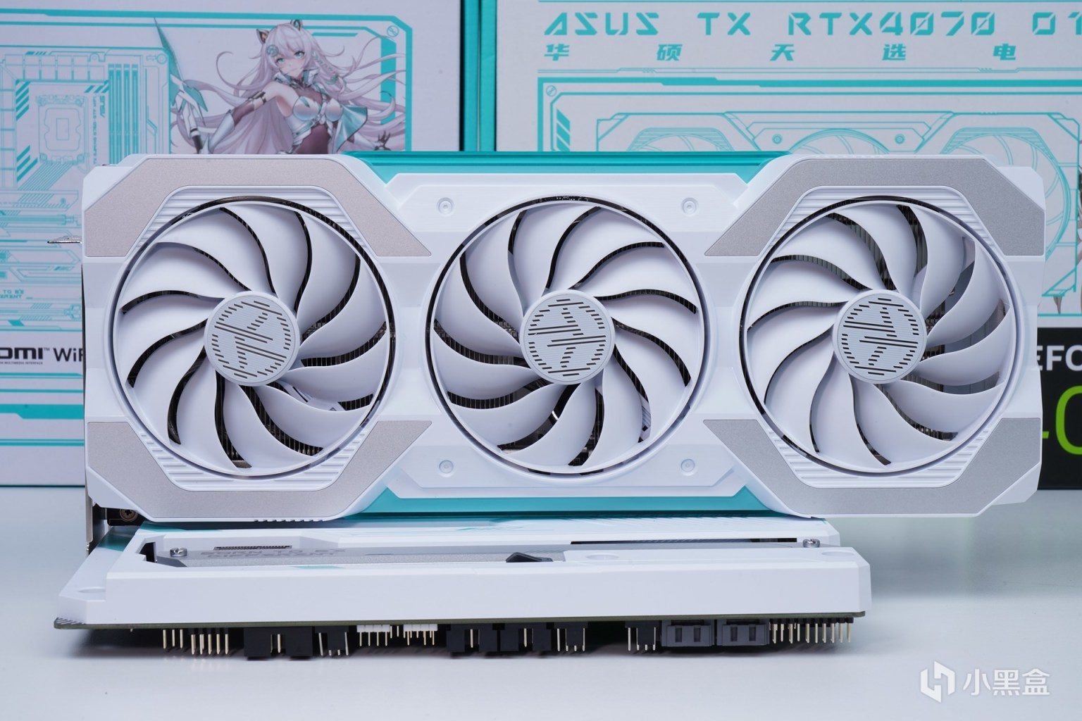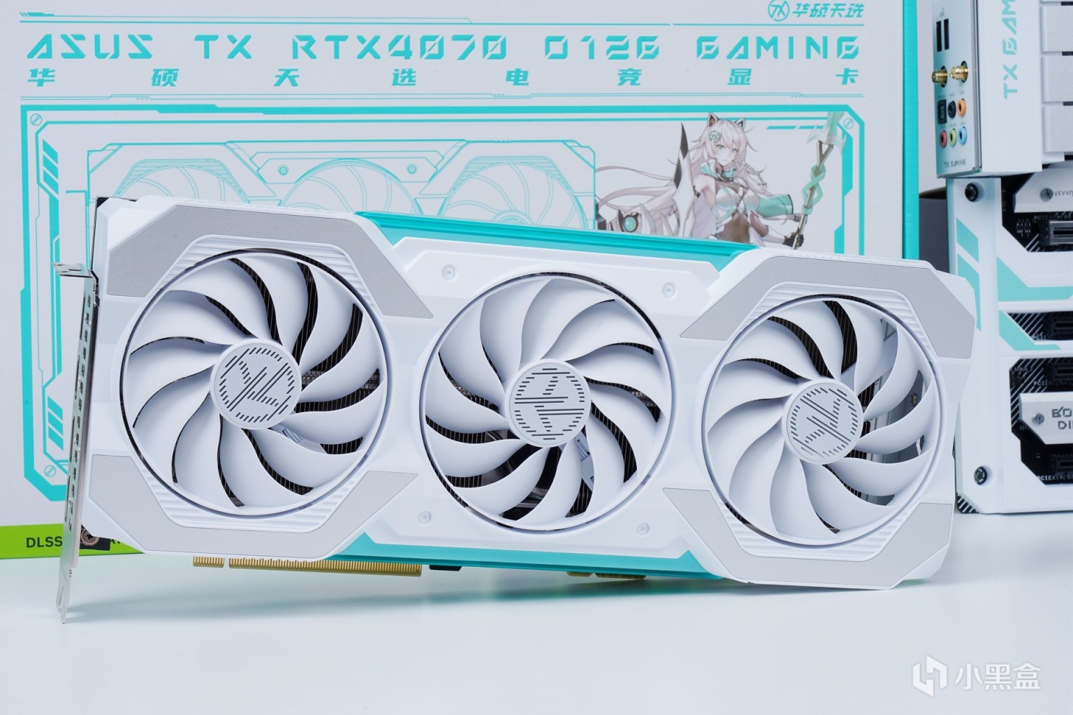 显卡方面,这里使用的是华硕TX GAMING RTX4070-O12G BTF,它和主板一样保持着天选系列标志性的白色+青色搭配,散热方面是大尺寸的热管散热以及三把轴流风扇,性能方面有Ada Lovelace架构的AD104核心以及12GB GDDR6X显存加持,游戏表现可以轻松实现百帧2K高画质的效果。