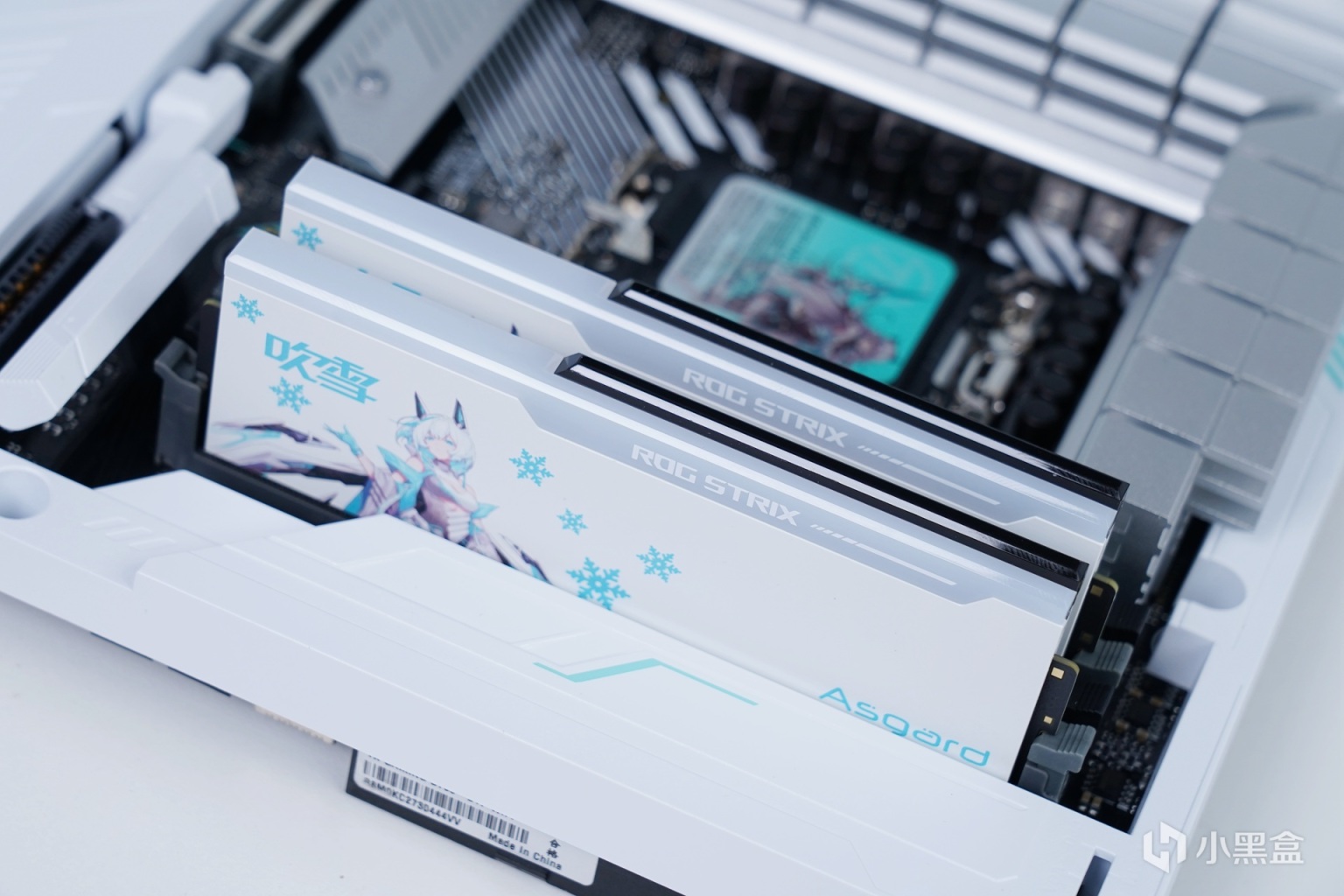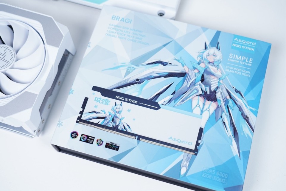 内存方面,我们拿来了阿斯加特的DDR5 6800MHz 16GB*2 RGB灯条-吹雪联名款进行搭配,它的外观保持了白色与青色的搭配,马甲表面还有RO姬的形象,并支持ARGB光效。除此之外,这套内存还使用了海力士的A-die颗粒,散热马甲与金手指也是加厚的1.8mm以及30μm设计,无论是稳定性还是超频能力都足够可靠。