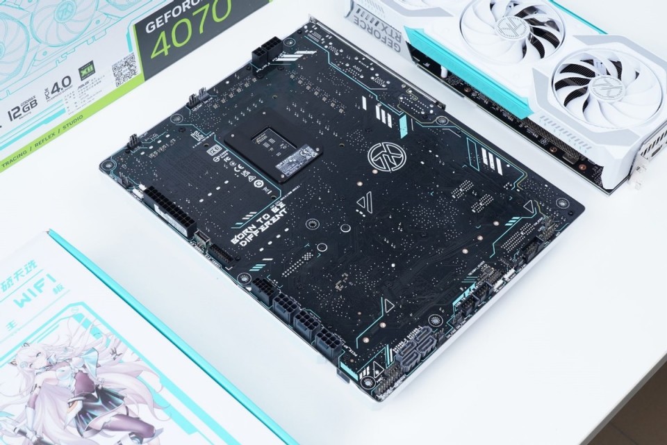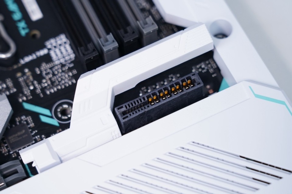 在显卡PCIe槽的右侧,我们可以看到专门针对BTF背插系统的GC-HPWR供电接口,这个接口和12VHPWR接口一样都是最大支持600W的功率,而且它是和PCIe槽对齐的,显卡插入的时候会连同PCIe槽一起插入,免去了外接电源线的负担。