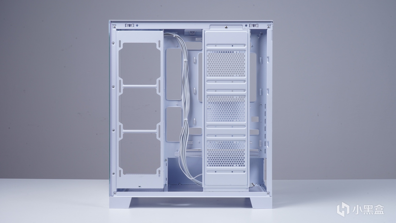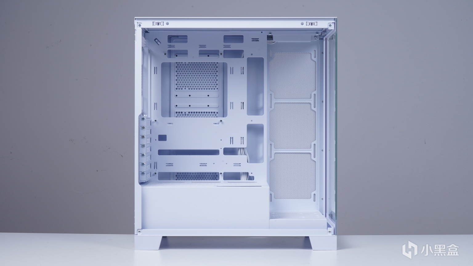 打开机箱另外一面侧板可以看到,先马元境界提供了三个12cm的风扇位以及四个SSD/HDD的硬盘位,同时机箱的I/O线材均使用了纯白的设计。