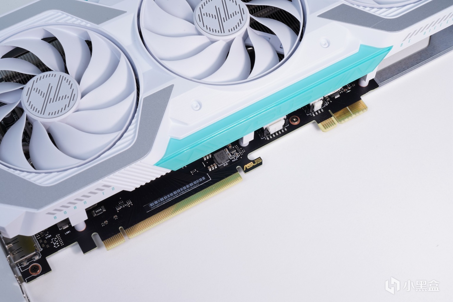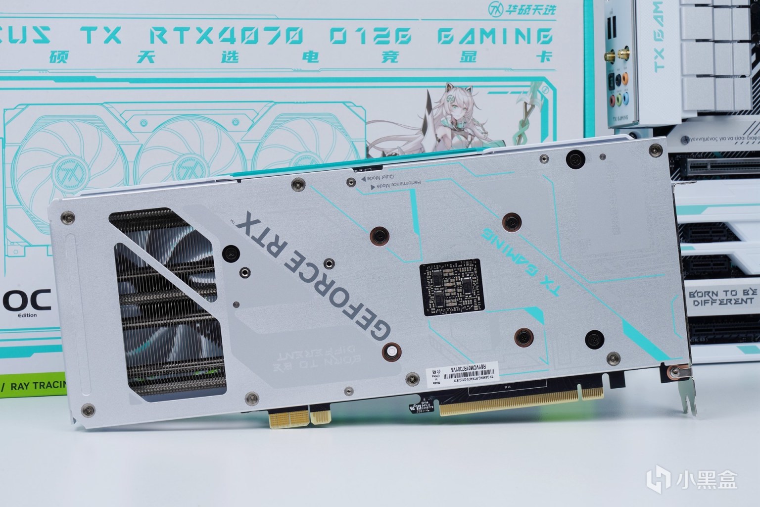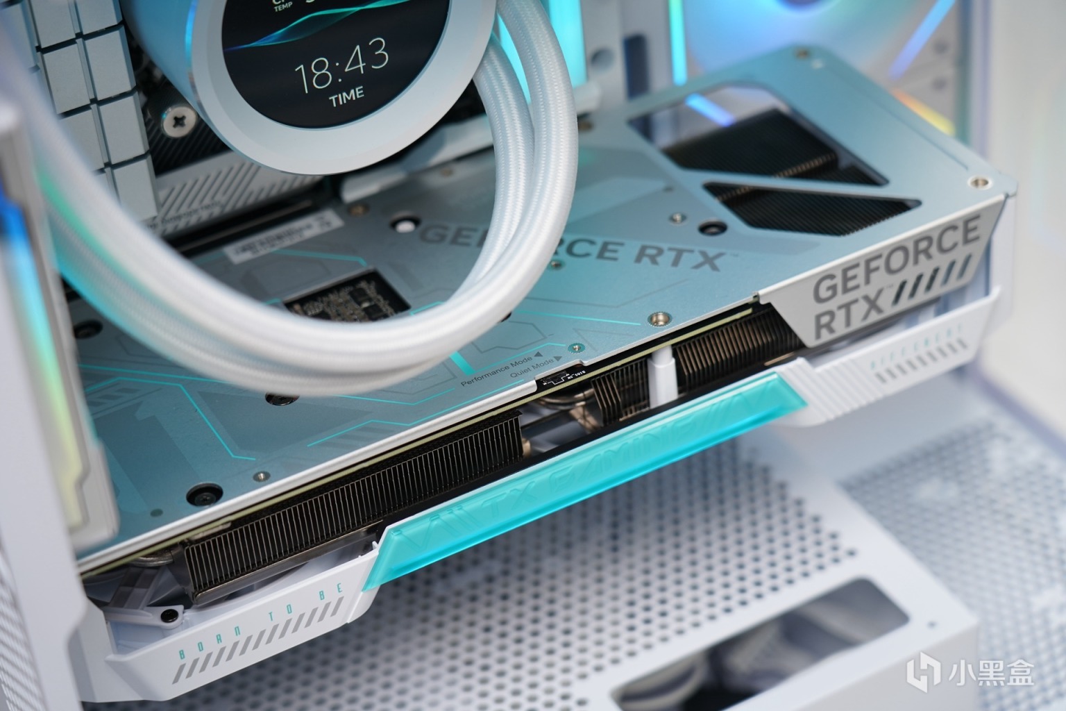 在显卡的背面处,我们可以看到带青色条纹点缀的白色背板,同时尾部处有镂空的散热设计。