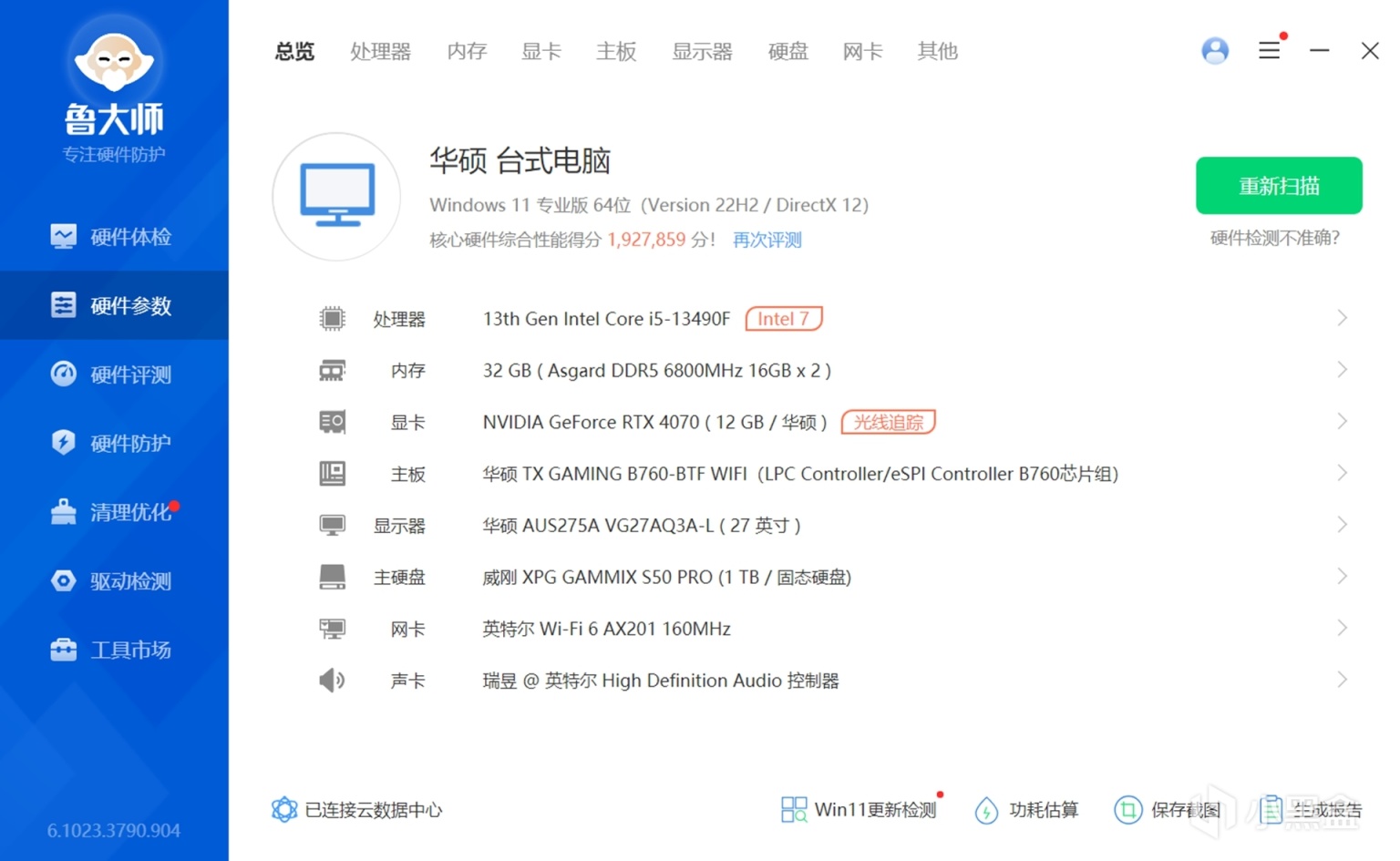 在鲁大师跑分当中,整机的综合性能得分是1927859分,接近200W大分。