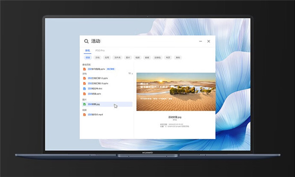 而华为MateBook X Pro提供了智慧搜索功能,只需在PC上输入文件名或内容关键词,智慧搜索就可根据文件类型清晰,即搜即得。搜索结果分类展示,清晰明了,并支持快速预览,效率翻倍。