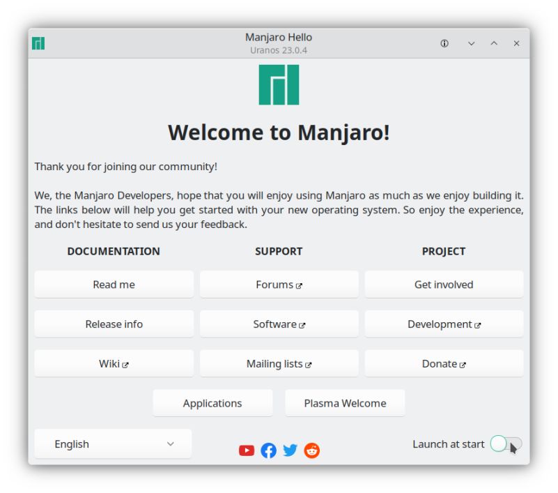登陆操作系统时的 Manjaro Hello 页面, 取消勾选 "开机时启动" 后不会弹出