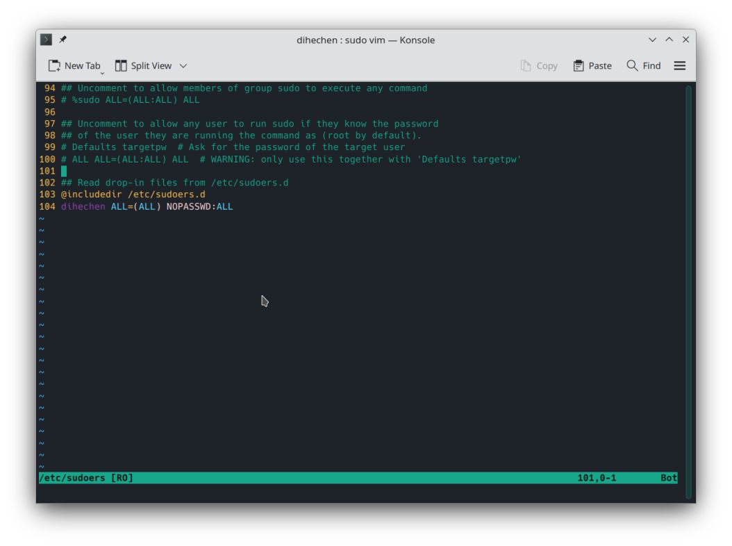 接下来是一个个人习惯, 就是每次新开一个 shell 使用 sudo 就要输入密码, 太麻烦了, 我需要修改 /etc/sudoers, 让我使用 sudo 不需要密码, 用 sudo vim /etc/sudoers 编辑这个文件, 将光标移动到最后一行, 按 o 插入, 内容是 当前登陆的账户 ALL=(ALL) NOPASSWD:ALL, 然后按 ESC 键返回 nvim 的命令模式, 输入 :wq 保存并退出。