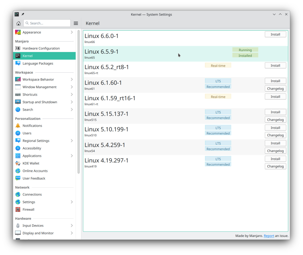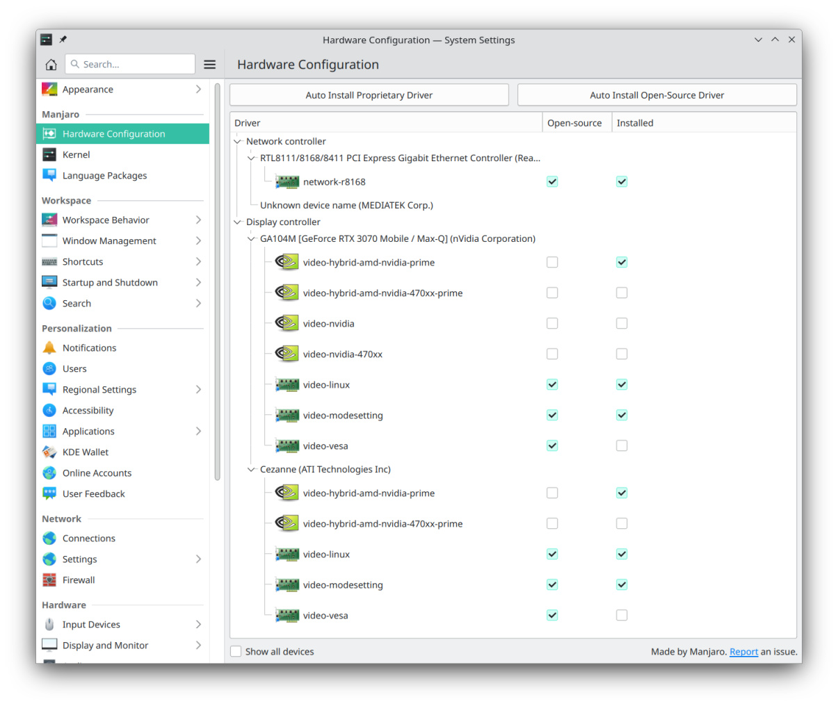 接下来我们需要安装驱动, 我们可以打开 开始菜单, 点击系统设置, 在 硬件配置 里可以看到自己的硬件的驱动, 这里可以选择自动安装专有驱动或是自动安装开源驱动, 专有驱动由硬件制造商开发, 一般用户无法访问其源代码, 性能一般会比开源驱动高, 可能会有兼容性问题, 开源驱动由 Linux 社区进行开发, 任何人都可以访问其源代码, 兼容性较好, 此处建议优先选择专有驱动, 如果出了兼容性问题再换开源驱动(这个选择只会出现在 Linux 用户群体, Windows 和 MacOS 只有专有驱动)。如果弄炸了, 可以在黑屏的时候按下 Ctrl + Alt + F2 进入 tty, 用 mhwd 干掉出问题的驱动, 驱动程序可以随时在系统设置里面更换。
