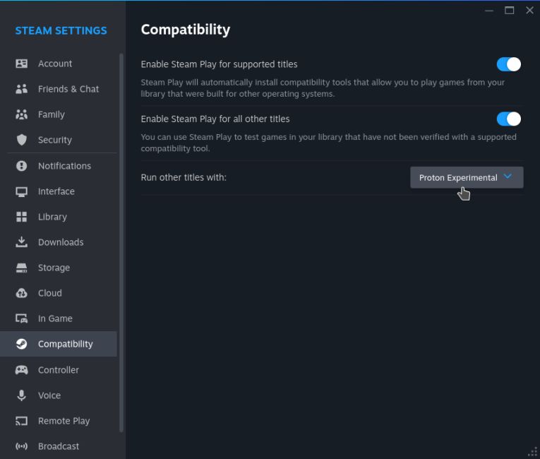 Steam 设置, 兼容性设置, 启用所有其他游戏的 steam play 功能