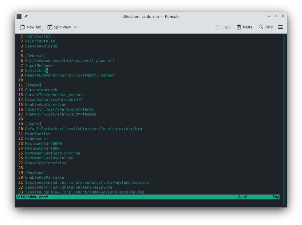 我还发现一个问题, Num Lock 键是默认关闭的, 这对我这种没有小键盘区就不会输入数字的人特别不方便, 不过这个问题很轻松的在 Manjaro 论坛上找到了解决方案, 我们可以用 sudo vim /etc/sddm.conf 编辑配置文件, 然后将 Numlock 的值设置为 on, 之后重启的时候 Num Lock 就是默认开启啦。