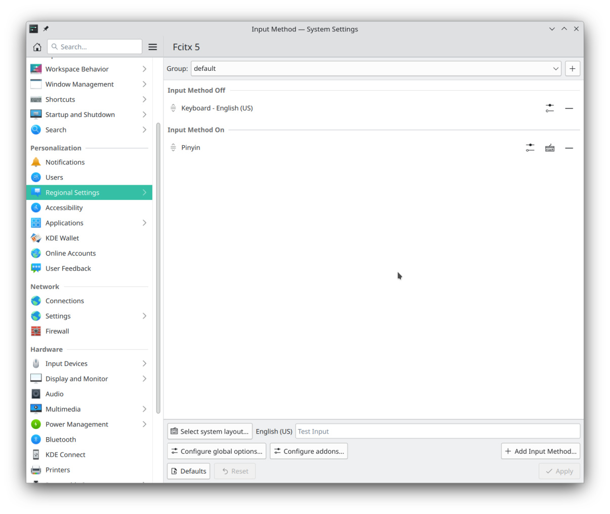 我们接下来可以为 Manjaro 配置中文输入法, 如果大家有过折腾 fcitx5 的经历, 配置中文输入法应该不难, 如果没有, 建议使用命令 sudo pacman -S manjaro-asian-input-support-fcitx5 一键配置, 然后在系统设置里的区域性设置找到输入法, 然后加入拼音输入, 应用更改后中文输入法就算配置完成。