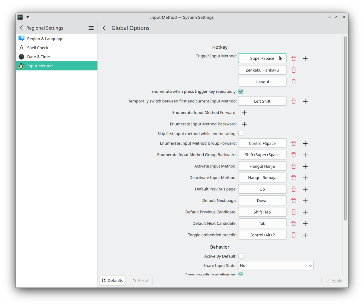 如果有这个习惯, 还可以在配置全局选项里将开启关闭输入法的快捷键由 Ctrl+Space 修改为 Super+Space (这个习惯来源于使用英文版 Windows 并且安装了中文输入法的情况默认的切换输入法的快捷键就是 Win + Space)。