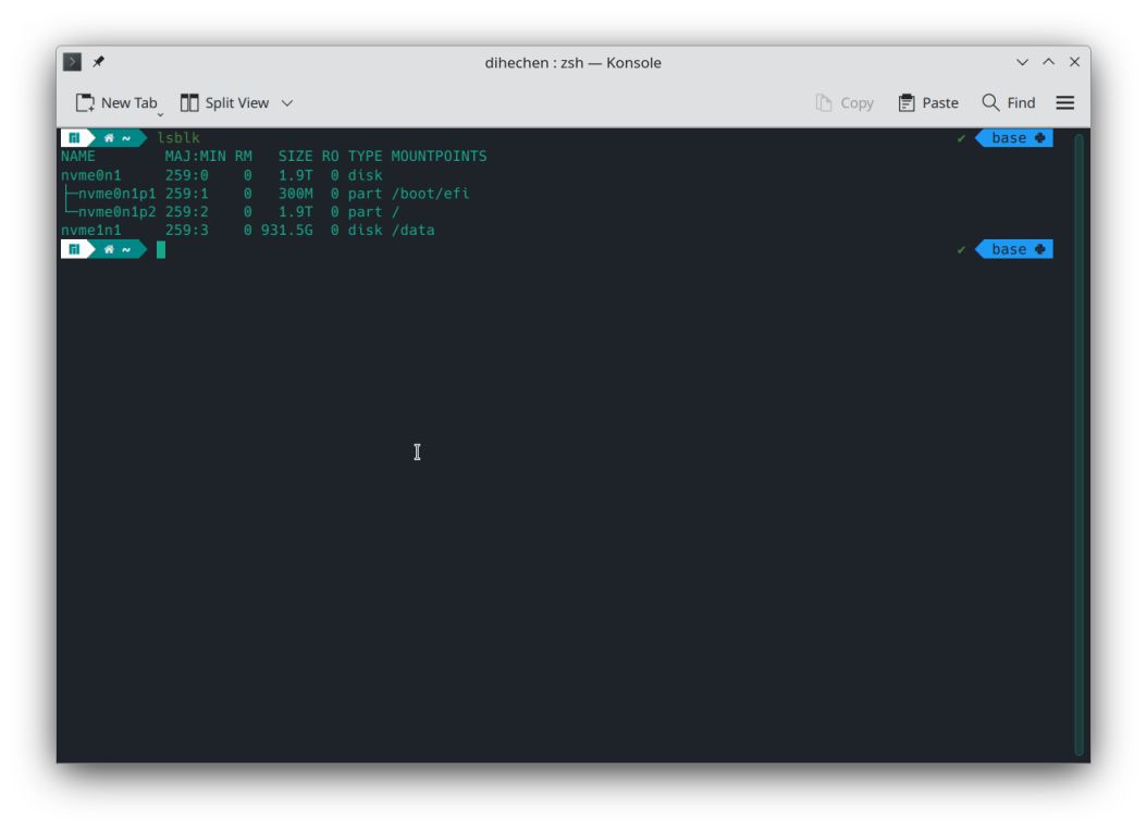 硬盘分区示例, 两块盘, 一块 2t, 分了 300MB boot 分区, 剩下的全分给根分区, 第二块盘 1t, 挂载到 /data
