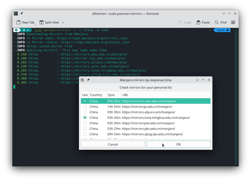 接下来我们得给 Manjaro 的包管理器更换源 (不然下载速度会相当感人), 我们先连接网络, 然后按下 Ctrl + Alt + T 打开终端 (kde 默认 shell 是 zsh), 输入 sudo pacman-mirrors -i -c China -m rank 然后按下回车, 勾选两个延迟比较低的镜像源(我选了清华大学和中科大提供的 manjaro 镜像源), 点击 OK 两次, 你的提示会和我的不一样, 如果你是第一次使用 sudo 命令, Linux 会给你 3 个提醒 (尊重他人隐私、输入之前思考后果, 能力越大责任越大), 并且要求你输入你的账户的密码 ( 就是你登陆时要输入的那个密码 )。