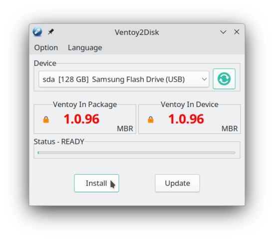 我们还需要一个 8GB 以上的 U 盘作为启动盘, 这里可以使用任意一个启动盘制作工具完成, 本文以 Ventoy ( 一个开源的启动 U 盘制作工具 ) 为例, 在官网或者GitHub下载之后打开, 选中自己的 U 盘, 点击 Install 安装, 等待几秒钟启动盘制作完成, 随后将上一步我们下载到的 Manjaro 镜像复制到 U 盘里, 至此安装 Manjaro 准备工作完成。
