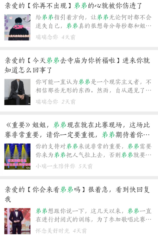 现在在微信订阅号内容里搜“弟弟”或是“姐姐你在吗”,就能看到一连串标题、封面画风非常类似的推文。