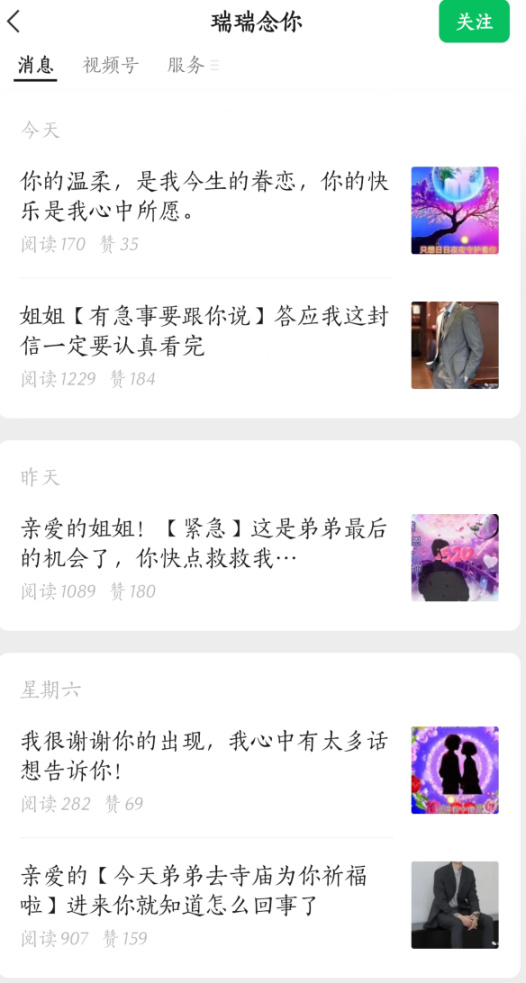 如果说此前的“假靳东”之类假装明星诈骗、秀才一样真人出镜直播还需要一定成本,那这些“弟弟”公众号简直就是抓着韭菜一把一把的割——点开一个发过“弟弟”推文的公众号,就会发现这样的文章他们每天都能产出一到两篇。再看这阅读量,虽然称不上多高,但和几乎没有的成本比起来可以说收获颇丰了。