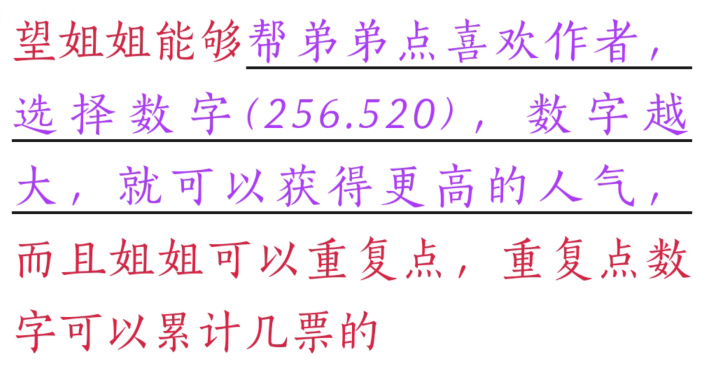 随后他就会帮“姐姐”找到问题的解决方案,点喜欢作者,选择数字“256/520”,越大越好,就可以帮他收获更多的人气,甚至还能“多点几下”,“重复计票”。