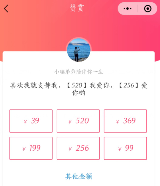 点进去以后,出现的是是一个与原装赞助类似的选择金额界面,只不过似乎每个选项的金额都变大了不少——前面提到的“520”、“256”赫然在列,“弟弟”还细心的给这两个数字加上了我爱你与爱你哟的注释。