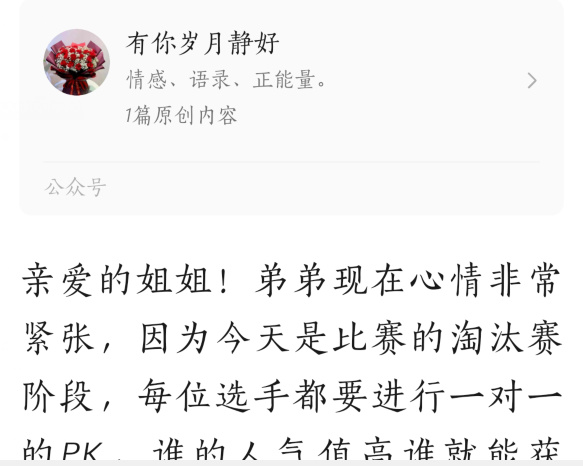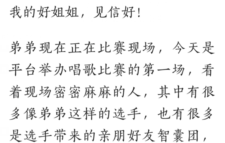故事往往发生在一个排名性质的比赛现场,它可以是公司考核,可以是唱歌比赛。作者会在文章的开头就称呼屏幕对面的读者为自己的“好姐姐”,并附带上“见信好”这样让对方明白这是一封来信的用词。