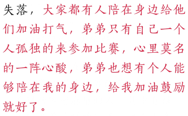 在三两句问候后,“弟弟”就会交代起自己在比赛中遭遇的种种不快:别人智囊成团,自己却孤身一人,想要有个人陪伴在身边,给他打气。