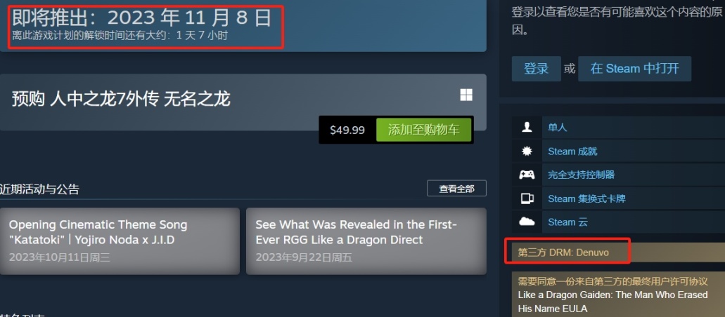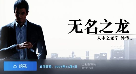 《如龙 7:外传 无名之龙》目前已开启 Steam 预载,该作将于 11 月 8 日正式在 PC 解锁,空间占用约 86.64 GB,实际下载大小约为 64.4 GB,本作加密系统为 D 加密: