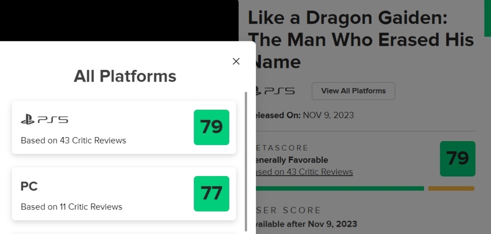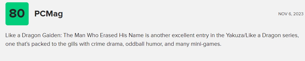 《如龙 7 外传:无名之龙》的媒体评测也正式解禁,该作 PC 版在 M 站媒体均分为 77 分,PS5 79 分: