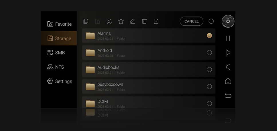 DMP-A8拥有一套完整的全功能媒体文件管理系统,可对本地硬盘、网络存储的文件进行常规快捷拷贝、复制、粘贴、剪切、删除等编辑管理操作。支持将USB OTG端口配置成USB OTG模式,方便电脑通过USB数据线连接本机进行本地文件的拷贝和管理,还支持内建SMB共享,可将本机连接的移动设备或者内置SSD存储的媒体文件通过网络共享给局域网下的其他媒体播放设备、电脑或者移动设备播放或者编辑管理,变身为家庭网络存储设备,随时共享您的高质量音源。