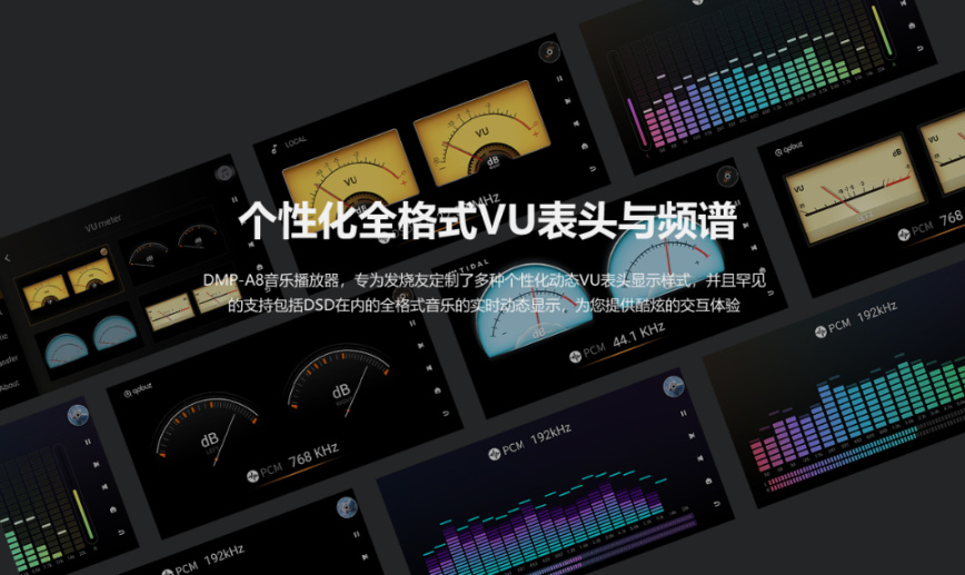 DMP-A8音乐播放器,专为发烧友定制了多种个性化动态VU表头显示样式,并且罕见的支持包括DSD在内的全格式音乐的实时动态显示,为用户提供酷炫的交互体验。