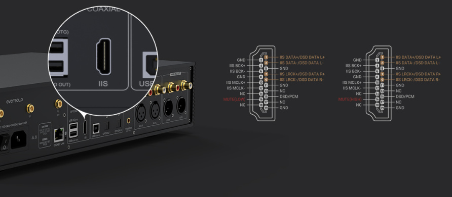 DMP-A8配备了IIS输出,轻松连接带有IIS输入的DAC,不同品牌外部DAC IIS信号Mute的电平不一样,可以通过软件设置切换MUTE PIN。支持最高采样率PCM 768K,DSD512。