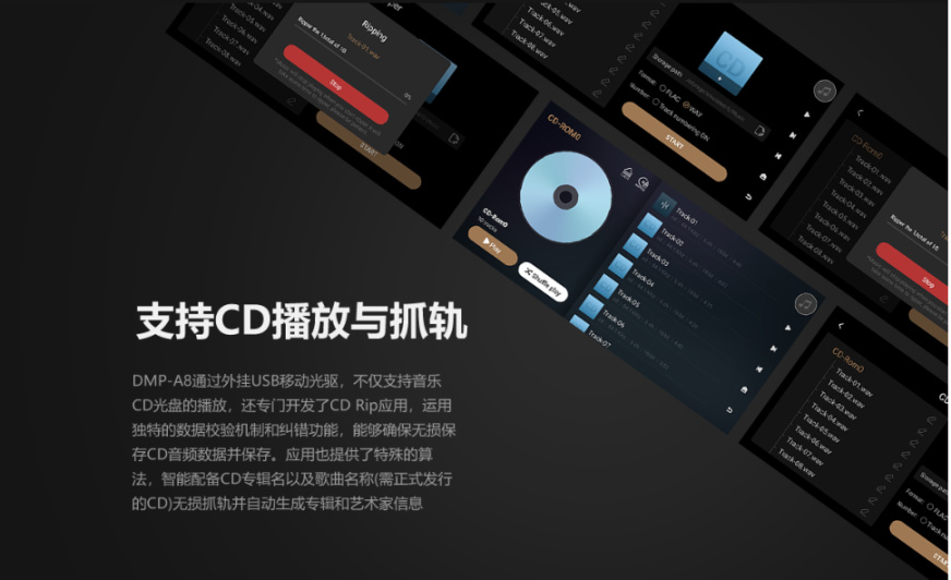 DMP-A8通过外挂USB移动光驱,不仅支持音乐CD光盘的播放,还专门开发了CD Rip应用,运用独特的数据校验机制和纠错功能,能够确保无损保存CD音频数据并保存。应用也提供了特殊的算法,智能配备CD专辑名以及歌曲名称(需正式发行的CD)无损抓轨并自动生成专辑和艺术家信息。