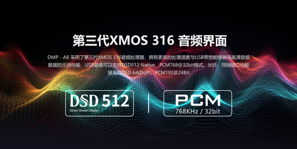 DMP-A8解码方案采用了XMOS 316音频处理器搭配旗舰DAC AK4191 + AK4499EX,解码格式最高能够支持 DSD512、PCM 768Khz@32Bit,并能够确保以极低的噪声和失真进行 D/A 转换,毫无保留地展现最真实的声音。