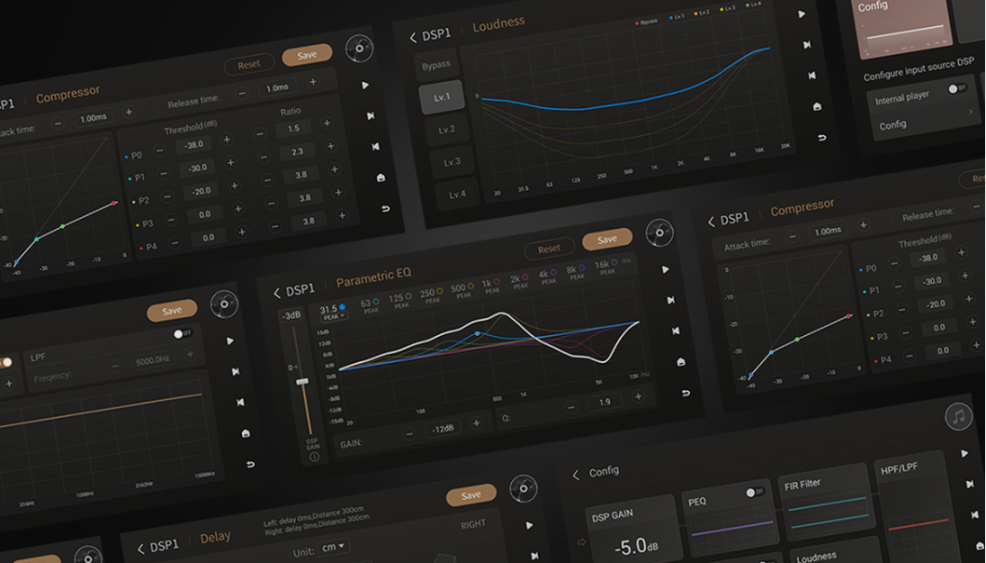 DMP-A8还内置了强大的硬件DSP处理器,DSP volume,PEQFIR Filter,HPF/LPF,Loudness,Compressor,Delay。