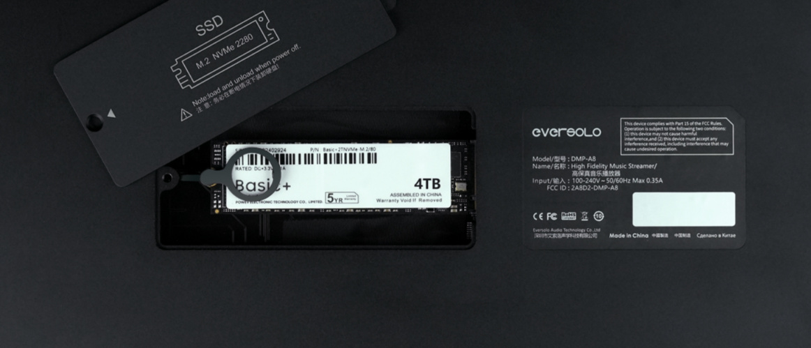 DMP-A8拥有灵活的存储扩展,机身底部集成了M.2 NVMe SSD插槽,仅需要使用螺丝刀拆卸SSD盖板即可方便安装SSD。DMP-A8支持高达4TB容量的SSD,速度更快、静音设计,为高品质本地音乐提供稳定存储。此外,还可以通过 DMP-A8 的 USB-A端口连接外部存储设备。