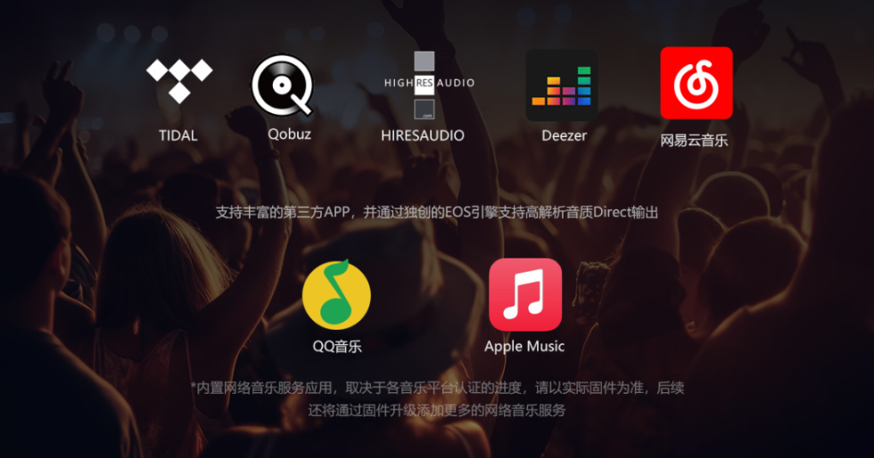 DMP-A8集成了诸多流媒体音乐服务,如TIDAL,Qobuz,HIRESAUDIO,Deezer,网易云音乐,也支持丰富的第三方APP,并通过独创的EOS引擎支持高解析音质Direct输出,如QQ音乐、Apple Music等。另外内置的网络音乐服务以认证进度为主,我们时刻都在推进新的网络音乐服务认证。