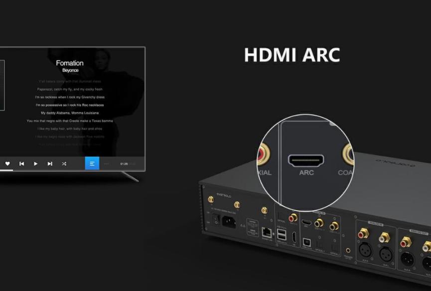 拥有HDMI ARC(音频回传通道)输入的DMP-A8,可以连接具有HDMI ARC功能的电视机、投影仪等显示设备,将HDMI信号中的音频信号分离出来传输给DMP-A8,使电视获得更高品质的声音效果。